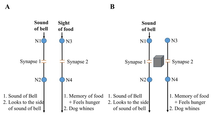 Figure 4. This figure illustrates two distinct pathways, A and B, through which two different stimuli propagate. Panel C presents one possible configuration in which these two stimuli converge to produce a change during associative learning. However, this configuration features only a single output neuron that is common to both stimuli, making it inadequate for supporting the type of conditioned learning depicted in Figure 1. This is because turning the head toward the sound of a bell and whining in response to food require the activation of different muscle groups.