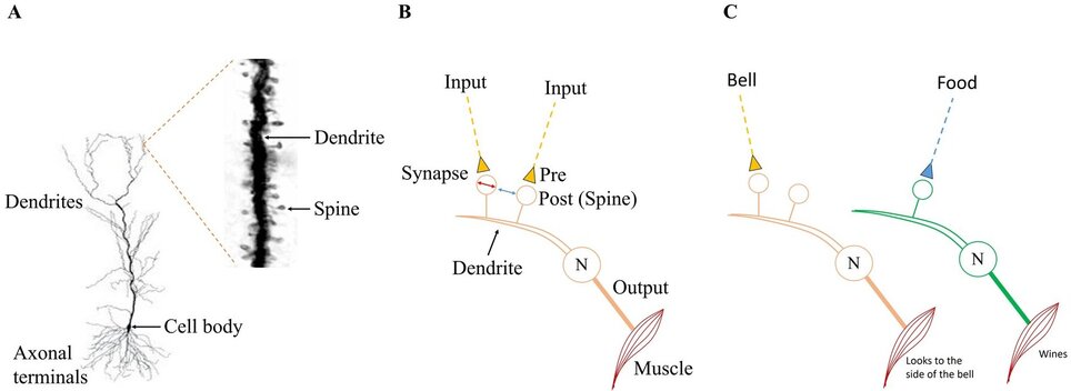 Figure 2. A) A pyramidal neuron from the CA1 region of the hippocampus (modified from Spruston N., 2008, Nat Rev Neurosci 9(3):206–221). The inset shows a Golgi-stained segment of a dendrite with several dendritic spines. B) A dendritic branch of a pyramidal neuron (N) with two dendritic spines - one input is from the conditioned stimulus (CS) and the second input from the unconditioned stimulus (US). Because the mean inter-spine distance exceeds the mean spine head diameter (Konur et al., 2003, J Neurobiol 56(2):95–112), inter-spine interaction across the extracellular matrix is unlikely. Since both inputs (CS and US) arrive on the same neuron & since each elicits distinct motor outputs, it is not possible to account for the different motor actions elicited by CS and US in this modified paradigm. C) To generate motor actions specific to both the inputs (modified CS & US), these stimuli may need to reach the spines of different output neurons (e. g for turning the neck towards sound & whining). Using this knowledge, it is necessary to find a solution. For now, it remains a black-box problem.