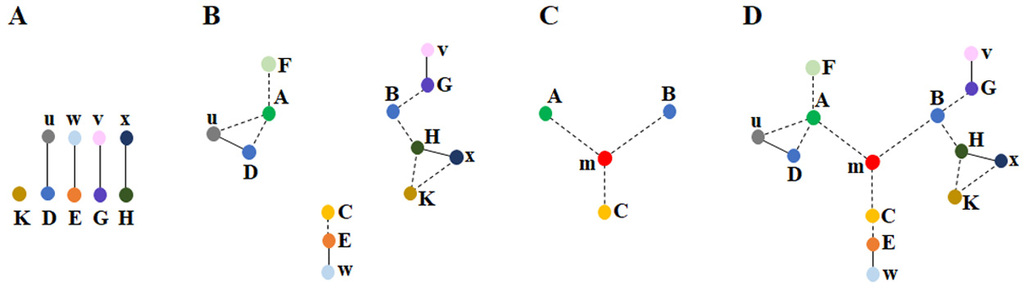 Figure 6. Method for deriving a solution to the system based on third-party observed findings. A) The features of the system are detected either directly (represented by the capital letter K) through our sensory systems or indirectly (represented by the capital letters D, E, G, H) through findings such as protein staining or behavioral observations. These features are connected through smaller letters (u, w, v, x), which represent relationships between the features (e.g., the observation of u enables the detection of D). B) By utilizing both commonly employed direct and indirect methods, three clusters of interconnected findings (depicted by dotted lines) are identified across different levels (observations from various fields of brain science). In many instances, it is not possible to establish connections between these clusters. For example, no direct connection was found between: 1) the changes in learning and the internal sensations of memory occurring at millisecond timescales, and 2) sleep and long-term potentiation (LTP). However, by examining the constraints within each cluster, we can assess whether they can be unified through a common operational mechanism. In the context of the nervous system, a vast array of findings and the constraints they provide can be explored. C) By leveraging the constraints from certain features within each cluster of seemingly unrelated findings (e.g., A, B, and C), we aim to derive a deep underlying principle (a structure-function solution m) that enables their interconnection. This solution is expected to offer a mechanism for generating internal sensations at millisecond timescales. D) The solution m provides an explanation of how the various findings within each cluster are interrelated with one another and with findings from other clusters, as shown in B). Although it remains undetectable by current biological investigation methods, the ability of solution m to integrate findings across all clusters makes it a further verifiable solution (Figure from Vadakkan, 2019).