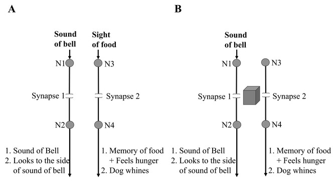 Figure 1. A modification of the classical conditioning experiment reveals a black-box problem that requires a solution. A) In this modified conditioning experiment, both the conditioned stimulus (CS) and the unconditioned stimulus (US) are capable of producing motor responses. Before any association is formed, the bell alone prompts the animal to turn its head toward the sound, while the food alone triggers whining, involving a different set of muscles. Through associative learning, the animal learns to associate the bell’s sound with the presence of food. The goal is to identify where and how this learning-induced change occurs. B) After learning, the sound of the bell alone produces behavioral and perceptual responses that are normally triggered by both the bell and the food. This presents a “black-box” problem, as current knowledge does not adequately explain a learning mechanism capable of generating these effects during memory retrieval.