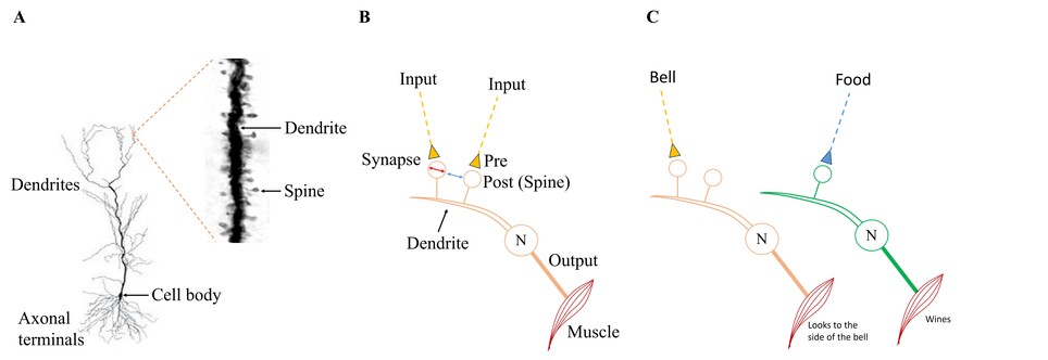 Figure 2. A) A pyramidal neuron from the CA1 region of the hippocampus (modified from Spruston N., 2008, Nat Rev Neurosci 9(3):206–221). The inset shows a Golgi-stained segment of a dendrite with several dendritic spines. B) A dendritic branch of a pyramidal neuron (N) with two dendritic spines - one input is from the conditioned stimulus (CS) and the second input from the unconditioned stimulus (US). Because the mean inter-spine distance exceeds the mean spine head diameter (Konur et al., 2003, J Neurobiol 56(2):95–112), inter-spine interaction across the extracellular matrix is unlikely. Since both inputs (CS and US) arrive on the same neuron & since both have their own motor actions, it is not possible to account for the different motor actions elicited by CS and US in this modified paradigm. C) To generate motor actions specific to both the inputs (modified CS & US), these stimuli must reach the spines of different output neurons? Using this knowledge, it is necessary to find a solution. For now, it remains a black box problem.